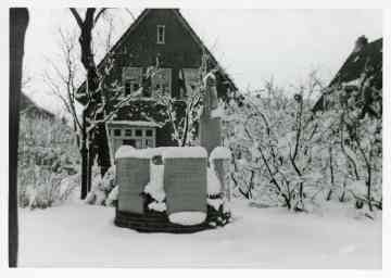 Een winters tafereel met het monument van de slachtoffers van de oorlogen. Het s