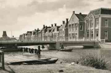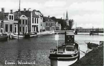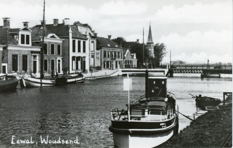 Een ansichtkaart met boten en de draaibrug. met links het gebouw van Woudsend Ve
