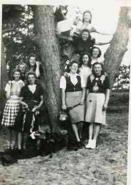 Op het muurtje voor café De watersport v.l.n.r. Truike van der Kooij, ?, Martsj