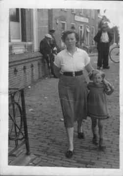 .Foto waarbij Midstrjitte Noord een rol speelt.Lin ks loopt Gerritje Posthumus e