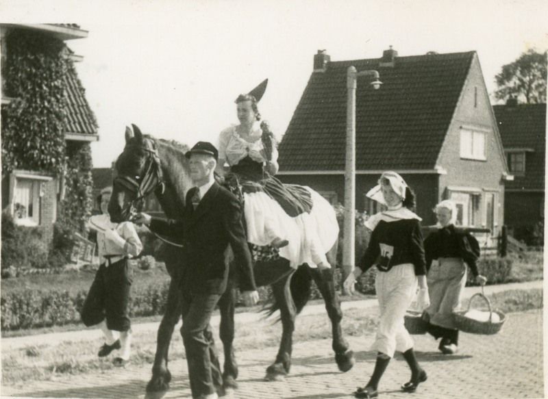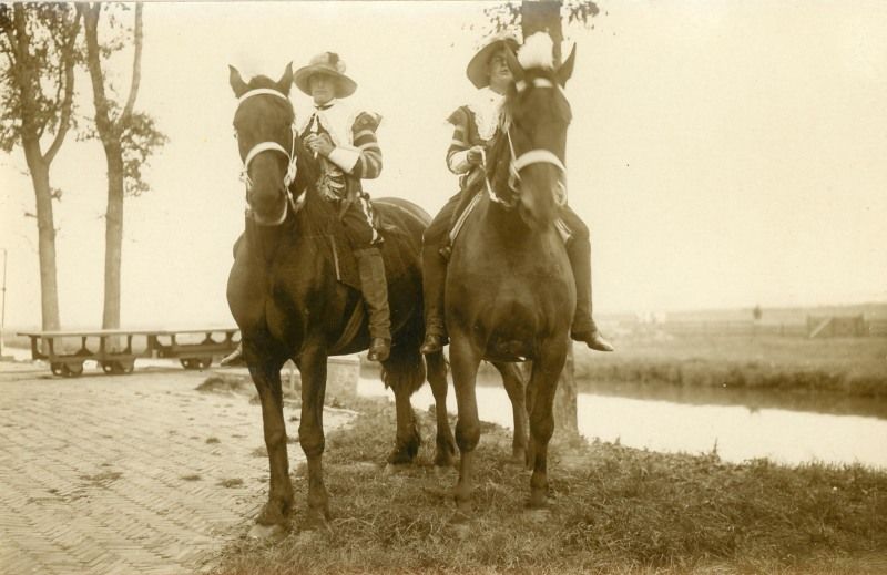 Achter op de foto is geschreven "Feest in Woudsend, Herauten te paard". Dat is o