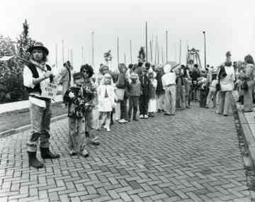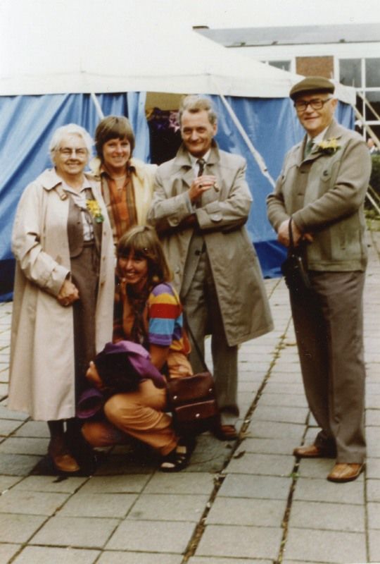 Een groepje mensen bij de feesttent van het feest van 1980. Rechts de heer Johan