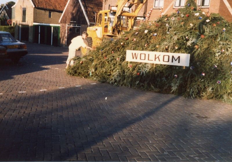 Hoe wordt bij het dorpsfeest een erepoort opgezet op 't krûs fan 'e Dyk? Een fo