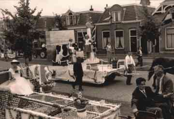 Voor de optochtwagen staan Pieter Glashouwer en mevrouw Van Brug.