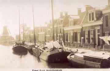 Een ansichkaart van Woudsend met molen Het Lam, de Ee met op de achtergrond de G