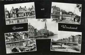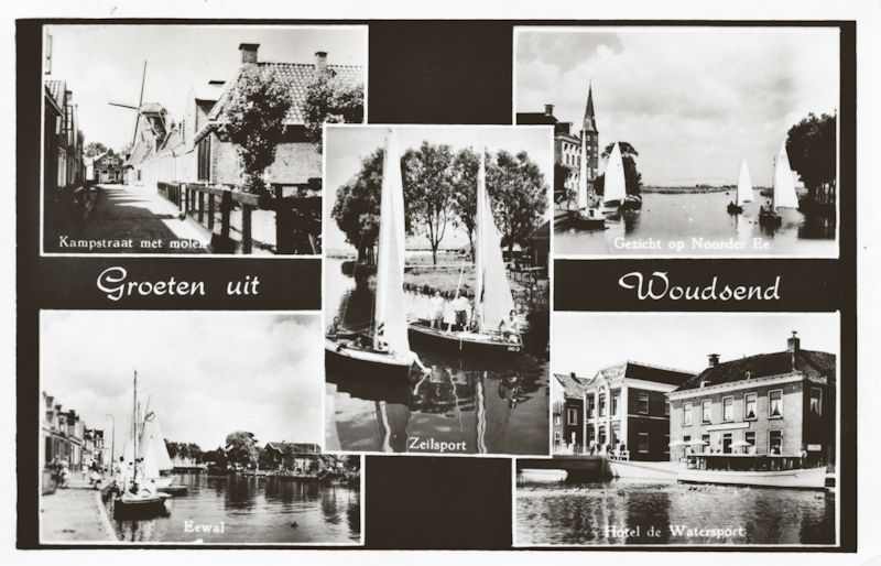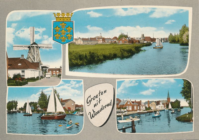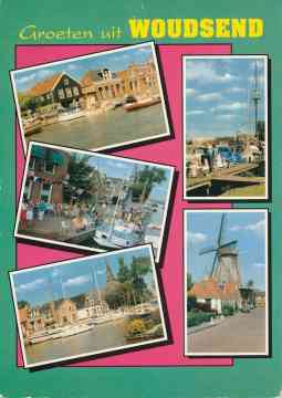 Een ansichtkaart Groeten uit Woudsend met foto's van de Ee, de Iewâl en molen '