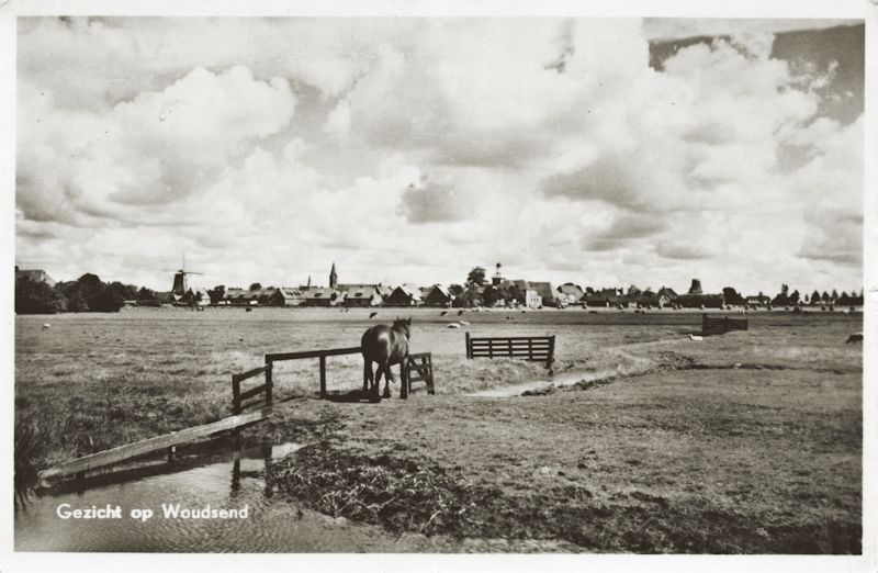 Een ansichtkaart met het zicht op Woudsend, bekeken vanuit het westen. De Kastan