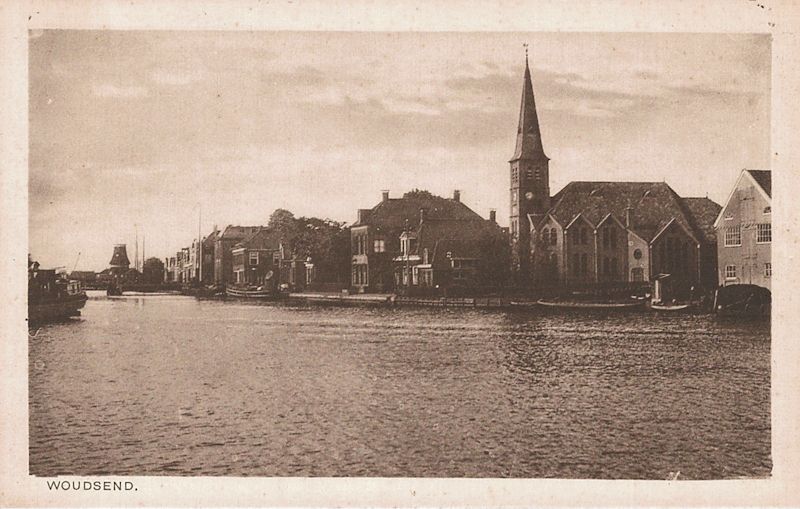Een ansichtkaart van Woudsend met o.a. de Ee, de gereformeerde kerk, molen It La