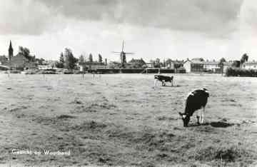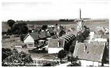Een ansichtkaart met het zicht op Woudsend, bekeken vanuit het westen. De Kastan