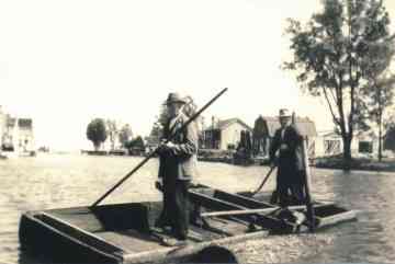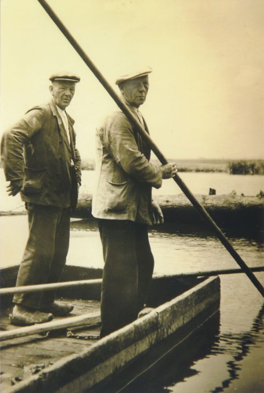 De gebroeders Otto en Jacob Nauta in de boombak om de boomstammen die in het wat