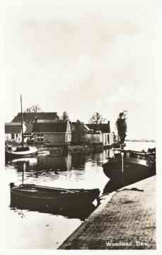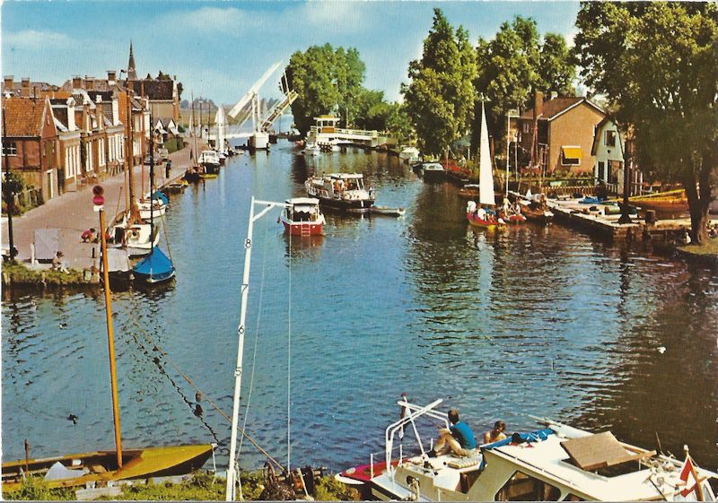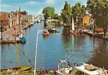 Een ansichtkaart met boten en de draaibrug. met links het gebouw van Woudsend Ve