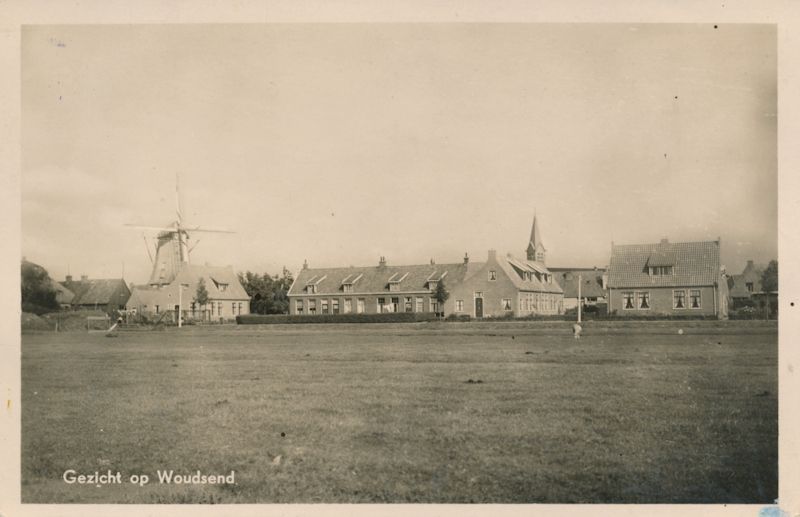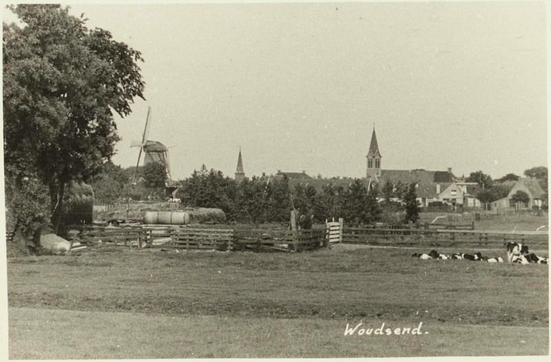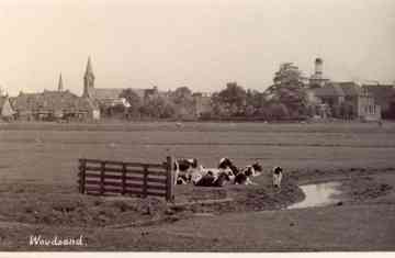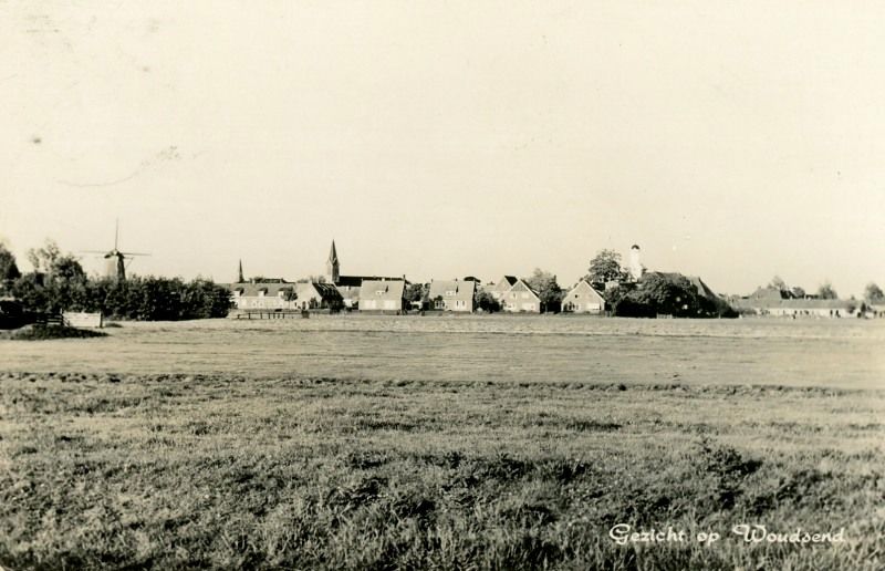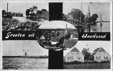 Een ansichtkaart met het zicht op Woudsend, bekeken vanuit het westen. De Kastan