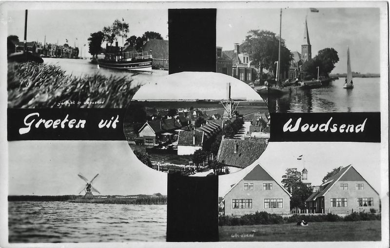 Een ansichtkaart van Woudsend met o.a. de Ee, de gereformeerde kerk, molen It La