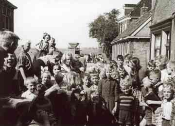 Een foto van de kleuters vlak na de oorlog met juf Jap de Vries (L) en juf Sip d
