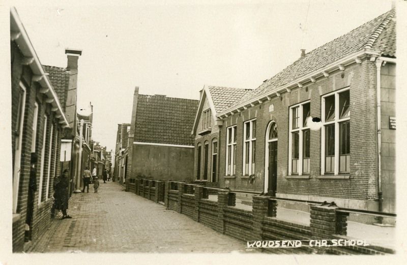 Een foto genomen voor het schoolgebouw van de Chr. Lagere School, Midstrjitte No