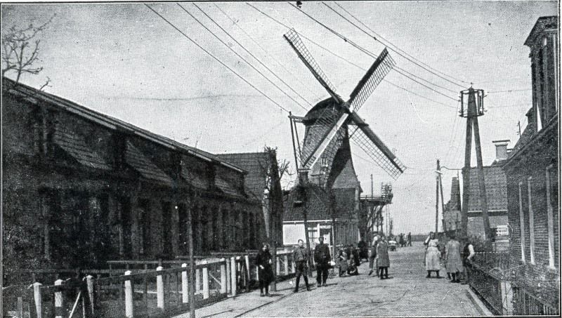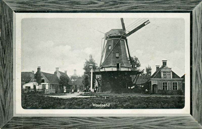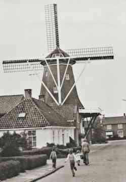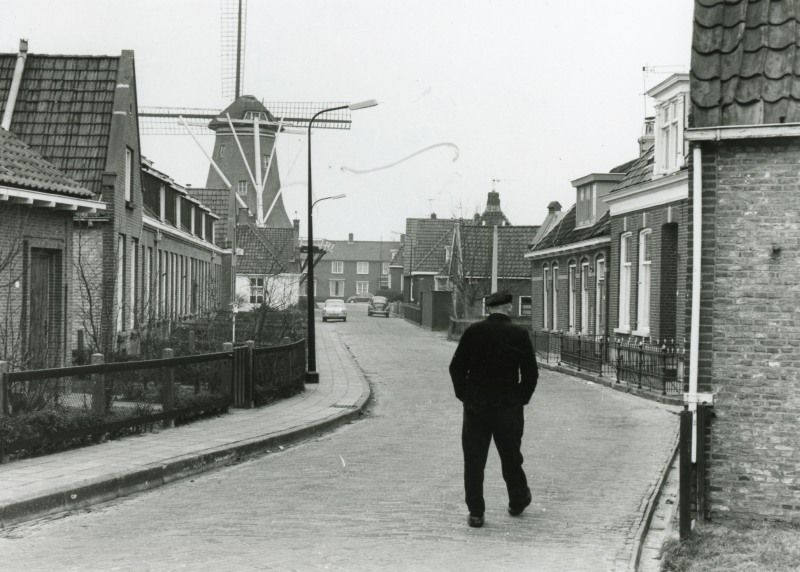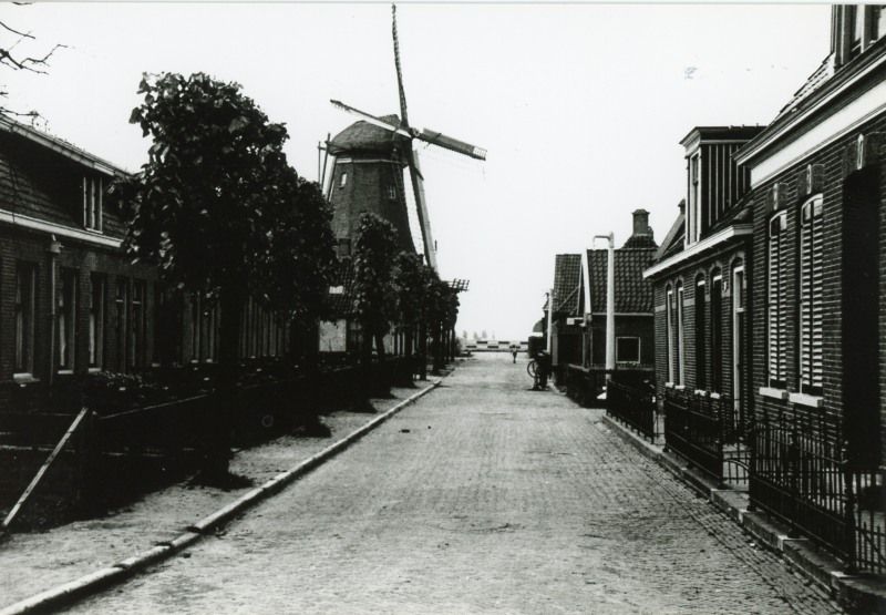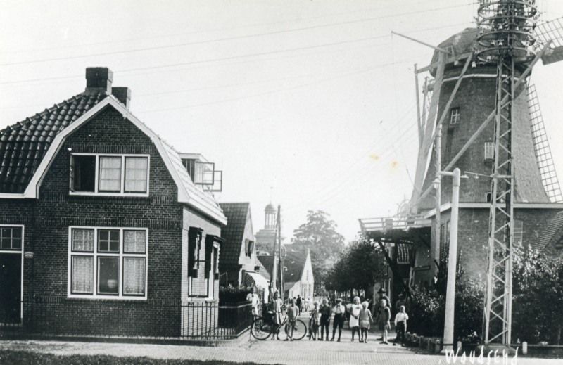 Gezicht van de Wegsloot op de molen en op de achtergrond de Herv. kerk. Opvallen