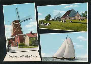 Een ansichtkaart met het zicht op Woudsend, bekeken vanuit het westen. De Kastan