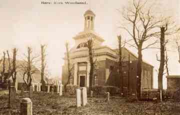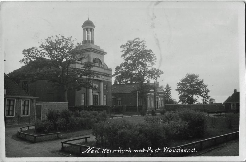 Een foto van de Hervormde kerk met daarnaast rechts nog de woning van de dominee