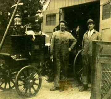 Een foto van de brandweerwagen voor de schuur waarin hij stond geparkeerd.