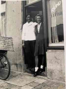 Popke en Anne in de deur van de slagerij aan de Nije Buorren. Popke overleed in