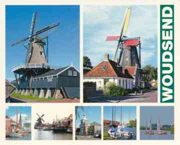 Ansichtkaart uit Woudsend met houtzaagmolen De Jager, korenmolen 't Lam, Iewal n
