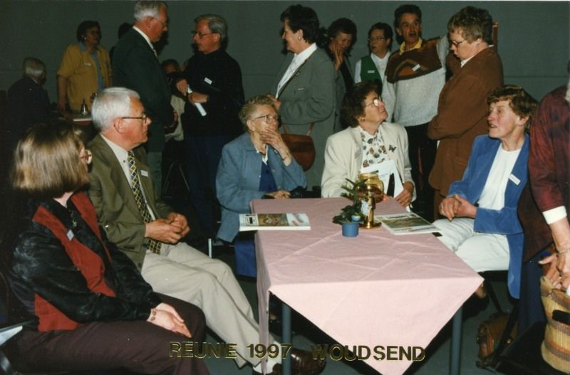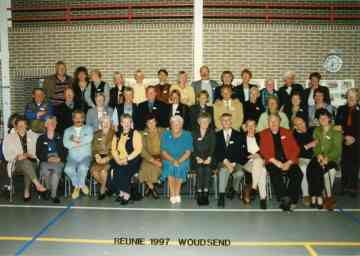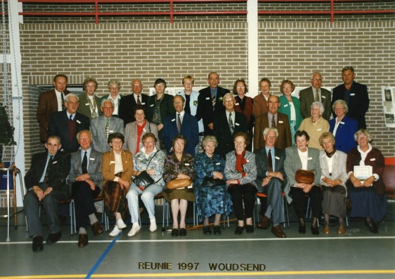 Een groepsfoto reünie 1997 met: Achter v.l.n.r.: ?, ?, ?, ?, ?, mevr. Rijpma, G