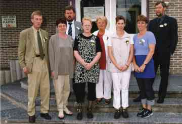 Een groepsfoto van een deel van de reünisten met o.a. Durk de Jong midden op de