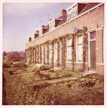 Foto van de arbeiderswoningen van de zuivelfabriek. Er is een versiering rond de