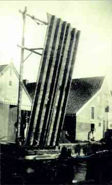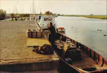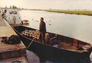 Melkvaarder Hessel Visser met zijn melkboot bij De Loswal. Hij haalde de melk op