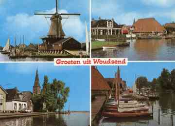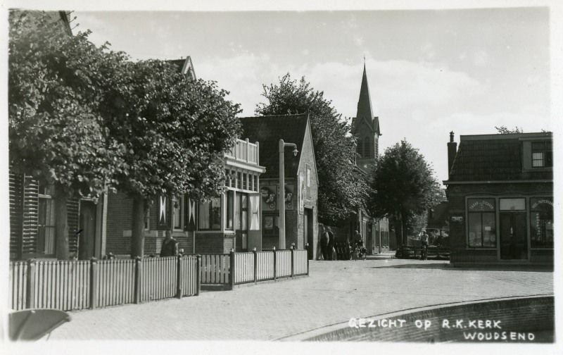 Foto met de tekst Gezicht op de R.K. kerk Woudsend. Dit is de Waechswâl, vroege