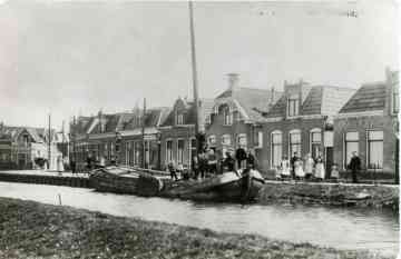 De Wegsloot met een afgemeerd skûtsje. Links staat een tilbury met een paard. H
