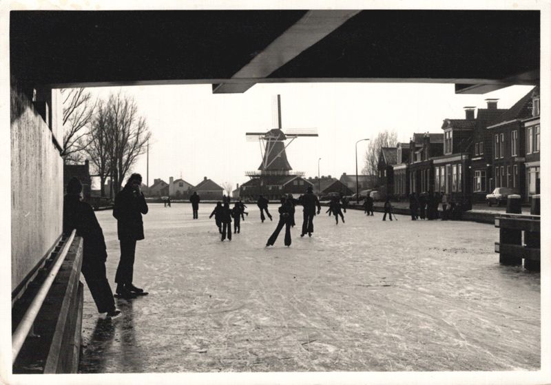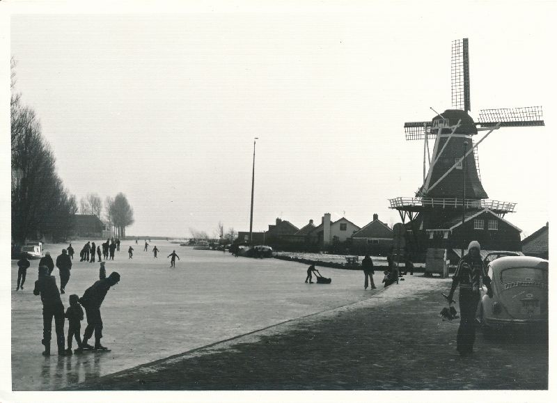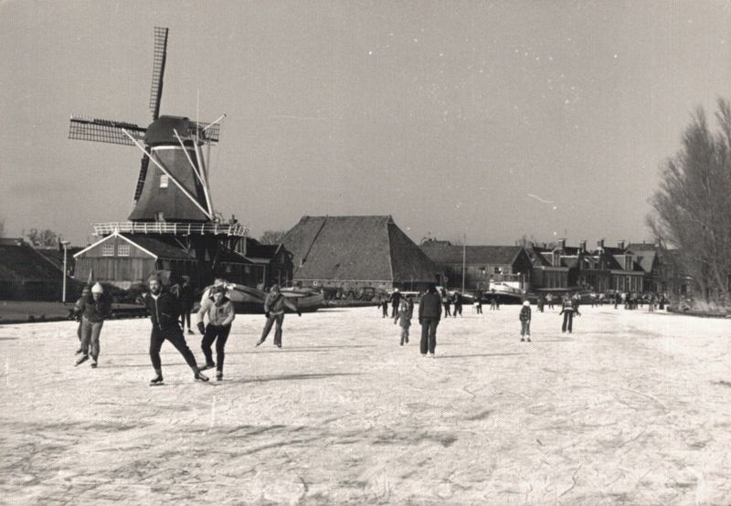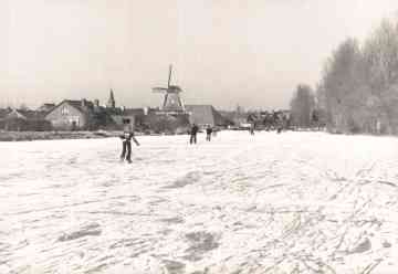 Schaatsen op de Ee met op de achtergrond houtzaagmolen de Jager.